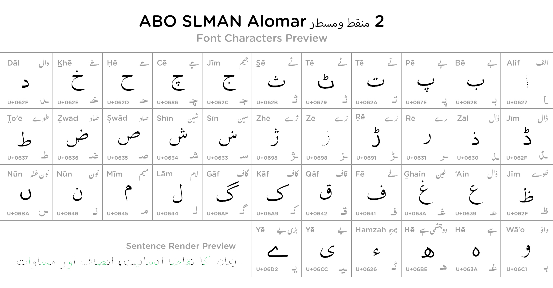 Abo Slman Alomar 2 has a similar counterpart with only a difference of a visible baseline beneath the letters or words. This line helps to trace the letters while staying in the lane. With a wide character set comprising 526 characters and 530 glyphs, it accommodates various language requirements and design preferences. Characterized by a medium font weight and normal font width, it balances readability and visual appeal. Its versatility extends to language support, covering Arabic, Latin, and symbols, making it suitable for diverse typographic applications, including educational materials, signage, and digital interfaces. Additionally, its compatibility with a wide range of Unicode blocks ensures seamless integration into various software environments, further enhancing its practicality and convenience.